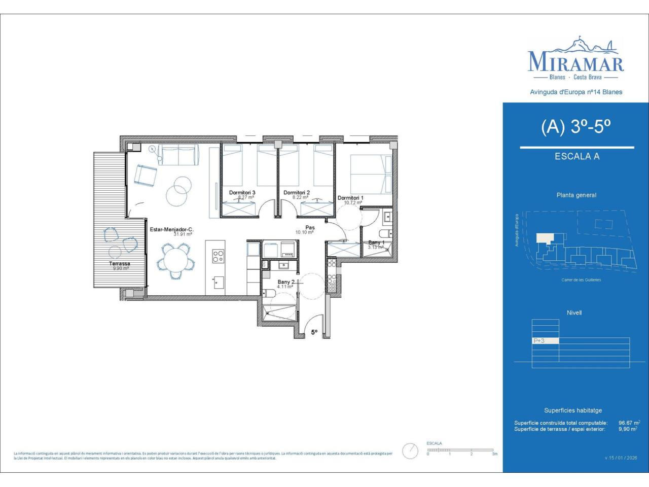 Plànol i informació sense caràcter contractual elaborada a partir del Projecte Bàsic presentat per a tramitació de la llicència d’obres. Informació subjecta a modi?cacions necessàries per exigències d’ordre tècnic, jurídic o comercial durant el transcurs de l’obra o una vegada ?nalizada la mateixa, sense que això impliqui alteració signi?cativa de l’objecte i sense minvar les qualitats dels materials. Infografies exteriors i interiors merament il·lustratives i subjectes a possibles modi?cacions; mobiliari no inclòs; acabats, qualitats, colors, equipament, aparells sanitaris i mobles de cuina aproximats. Tota la informació i lliurament de documentació es farà segons el que s’estableix en el Reial decret 515/1989 i altres normes que poguessin complementar-ho; ja siguin de caràcter estatal o autonòmic.